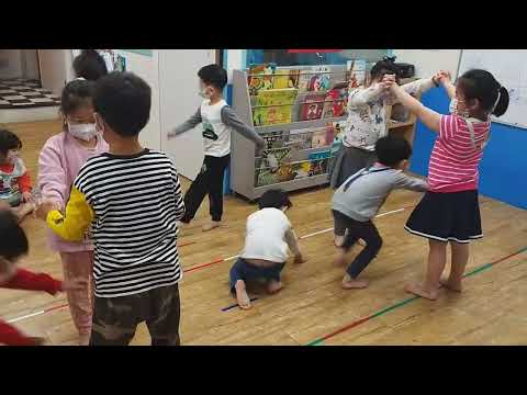 念唱「丟丟銅」的歌謠,歌唱期間火車要穿過每一個山洞,歌唱停止時,山洞組幼兒攔下正在山洞中的人,再開始歌唱時,讓火車組幼兒繼續到處鑽山洞,以此類推。