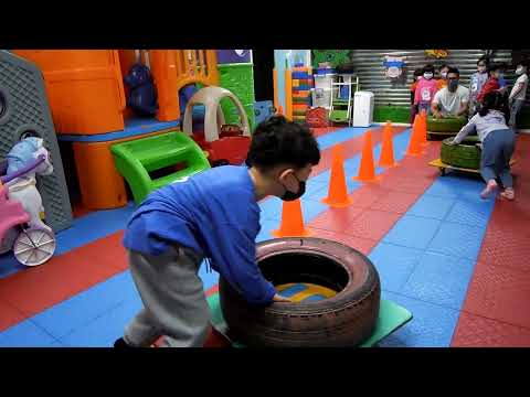 今天老師準備了大滑板和輪胎來給小朋友玩哦!先請孩子推著滑板滑動,再把輪胎放在滑板上,兩人一組,一人坐在上面,一人推,最後再兩人一起坐在滑板上,用腳滑動唷!